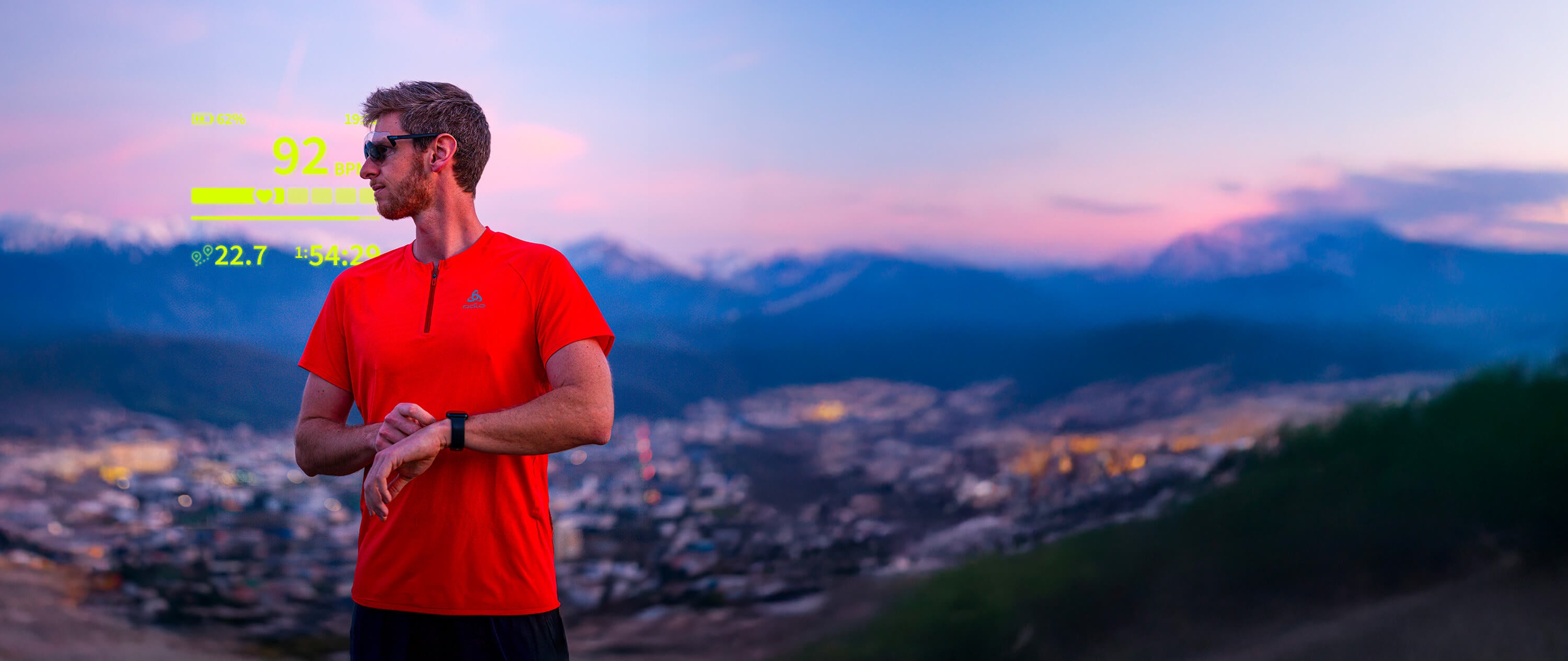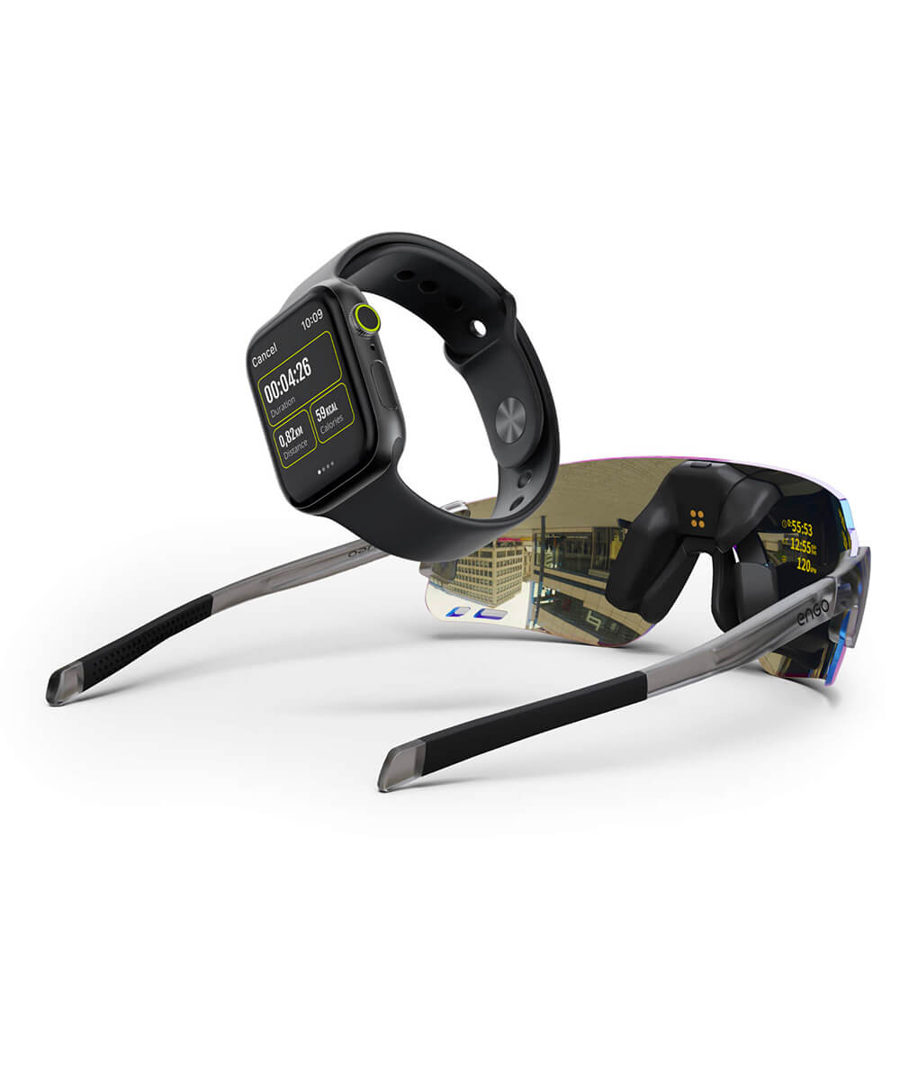Download the ActiveLook app and pair your ENGO via Bluetooth. Adjust the frame to position the display perfectly in your line of sight. Apple Watch: The companion app installs automatically - just launch and run. Garmin: Download the ActiveLook data field from Connect IQ and add it to your activity screen. You're ready to train.
